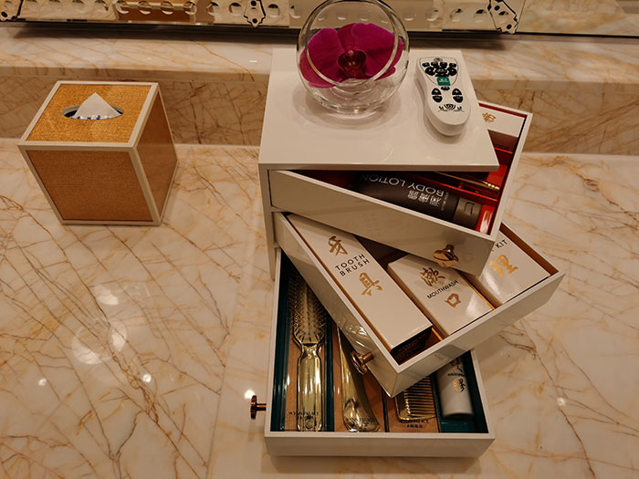 澳門永利皇宮酒店客房一次性用品標(biāo)識(shí)的個(gè)性化設(shè)計(jì),以旋轉(zhuǎn)的方式來(lái)呈現(xiàn)。