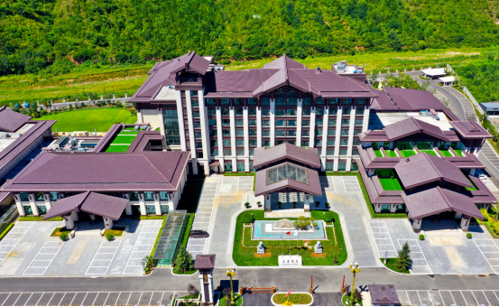 莊普酒店就藏在這一片群山環繞下的山谷中,4萬余平米的新中式建筑群由國內知名設計師精心規劃打造。